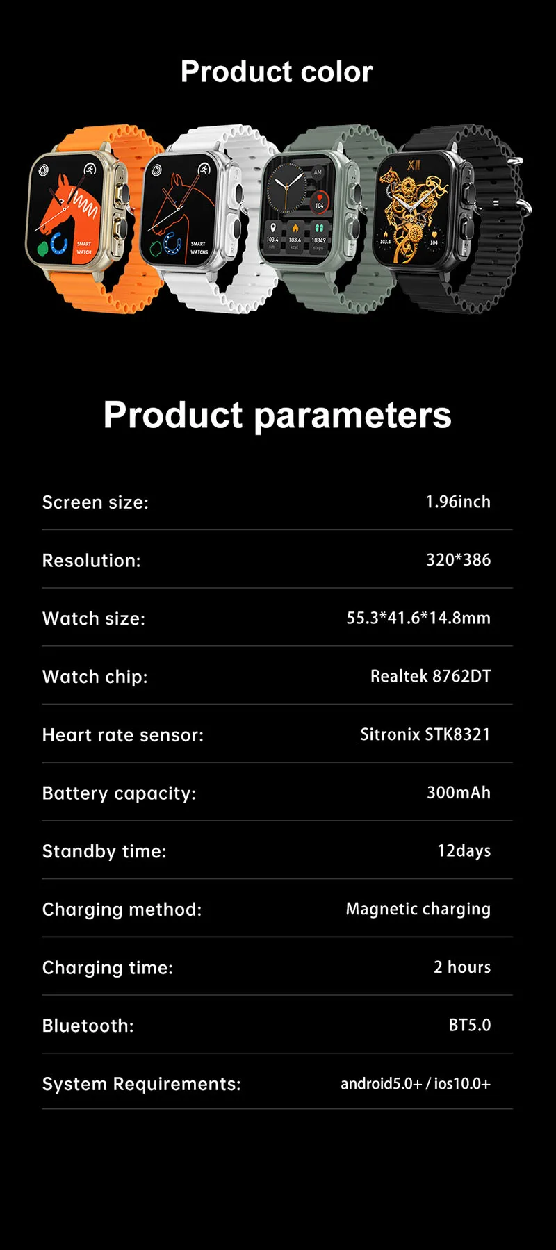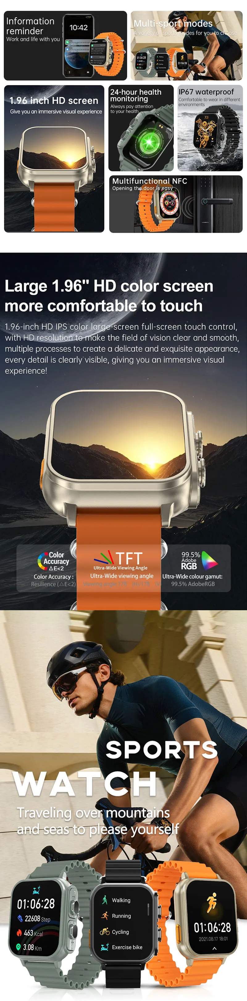 2. Design elegante: Trabalhada com precisão usando artesanato metálico, garantindo durabilidade e um visual moderno. O smartwatch possui uma pulseira única de duas cores e uma tela sem moldura de 1,96 polegadas, proporcionando uma experiência de visão completa de alta definição.