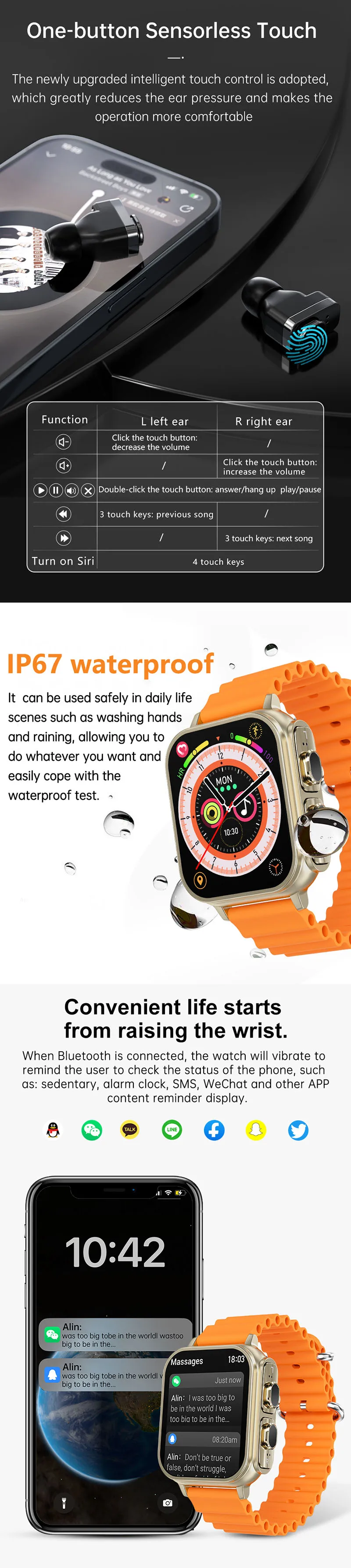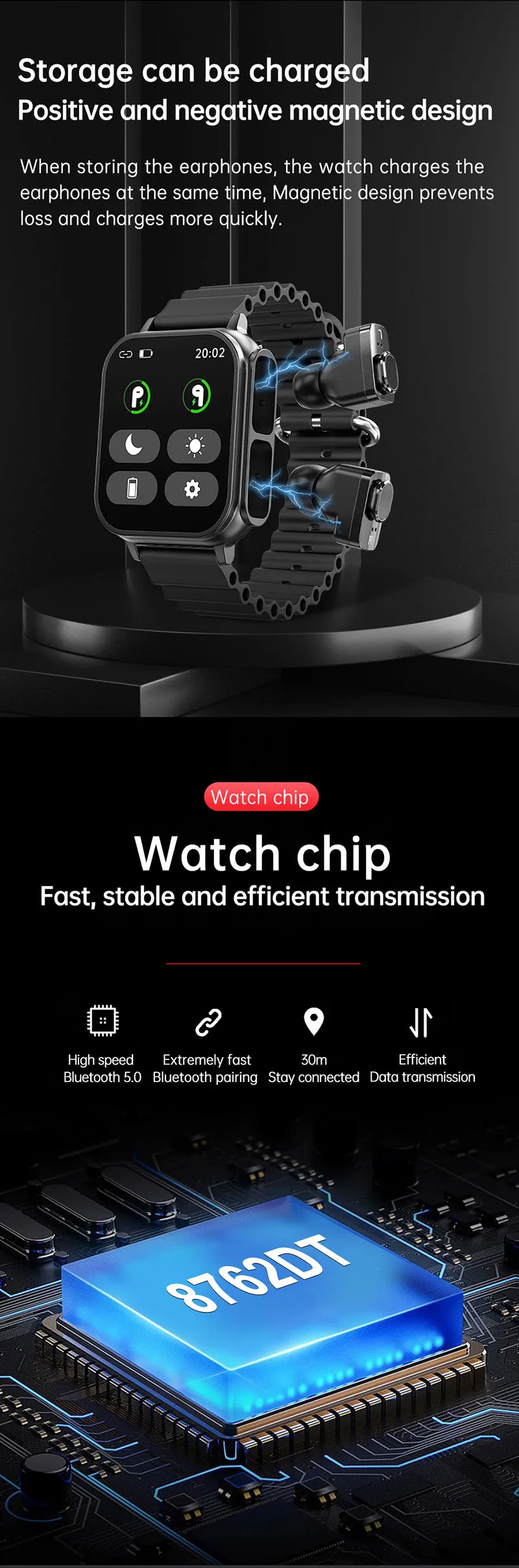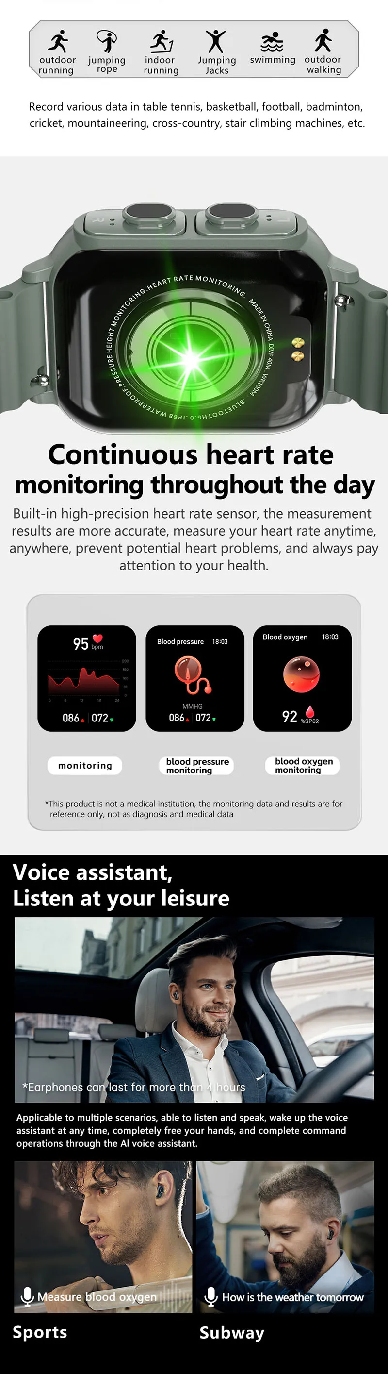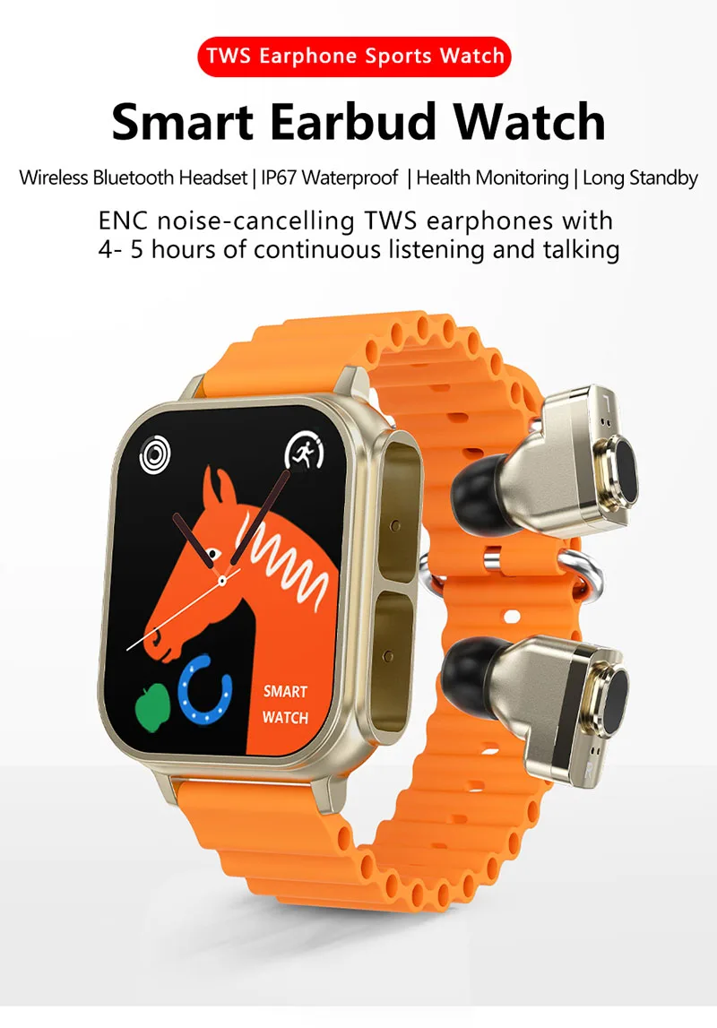 1. Fones de ouvido compatíveis com Bluetooth + pulseira inteligente: aproveite a música com fones de ouvido compatíveis com Bluetooth integrados, atendendo à sua necessidade de ouvir músicas sem fio.