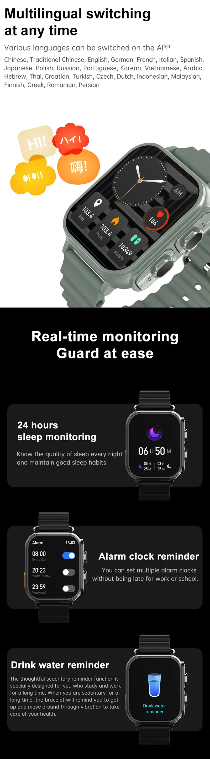 4. Suporte Global ao Idioma: Suporta 26 idiomas globalmente, tornando o smartwatch esportivo acessível a usuários de diferentes regiões. Notificações configuráveis para 26 países, garantindo alertas personalizados e personalizados.